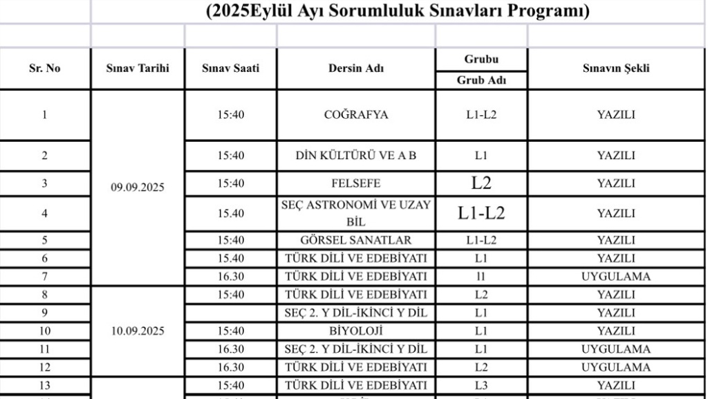 Eylül 2025 Sorumluluk Sınavları Takvimi